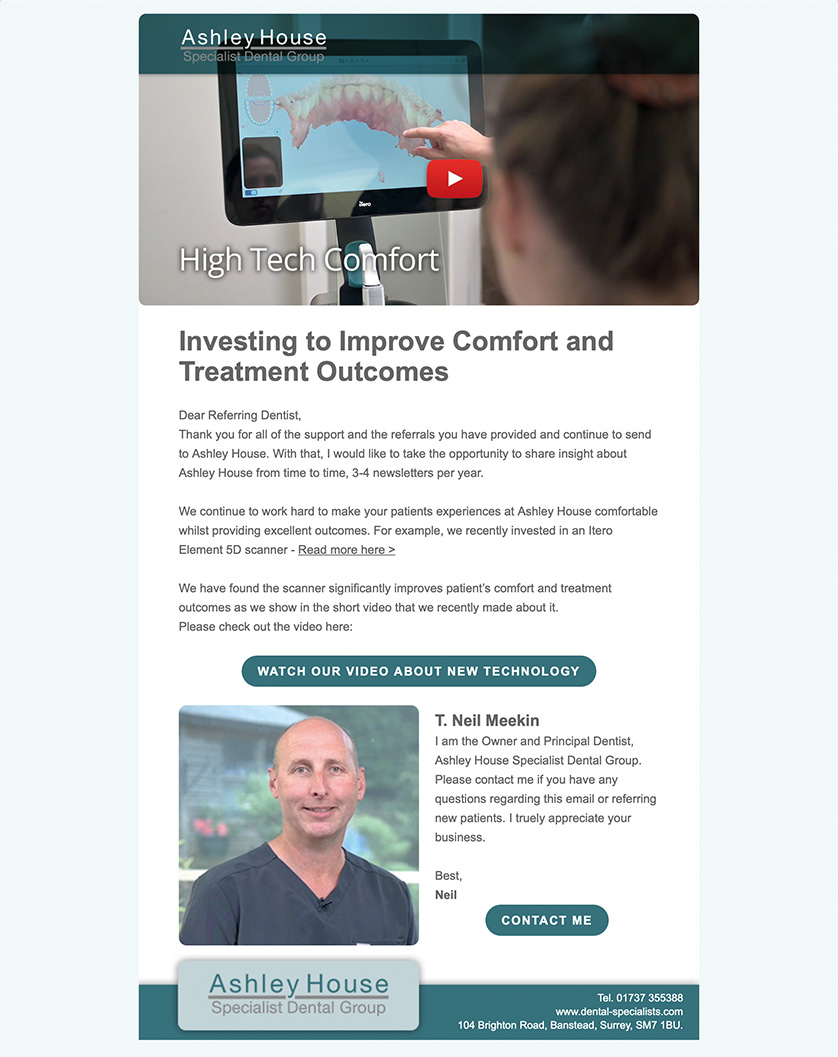 Dr. Neil Meekin believes his practice - Ashley House Specialist Dental Group - stands out by giving patients a more comfortable experience through advanced technology. Dr. Meekin uses AutoRemind’s mass communication feature to create email newsletters to highlight new technology designed to make dental visits less stressful and more pleasant for patients. These newsletters help Neil stay top of mind with his patients and remind them what they appreciate about his practice.