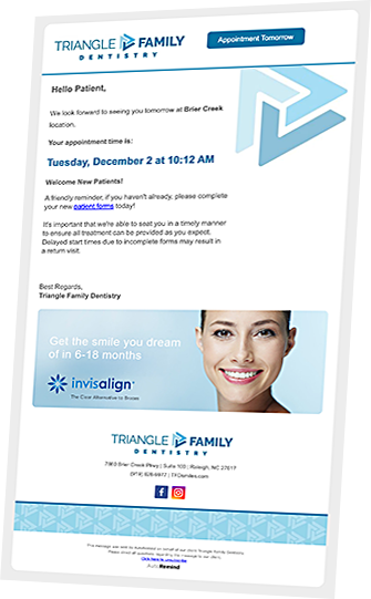 Experiencing our smart reminder system is like watching on a 75 inch TV after using a 24 inch one! Our technology is bigger, better, and more robust. We enhance reminders with your brand and relevant info for every appointment type. We avoid redundant contacts; no triple messages for triple-booking and only one message per family! Just a few of our notable differences!
